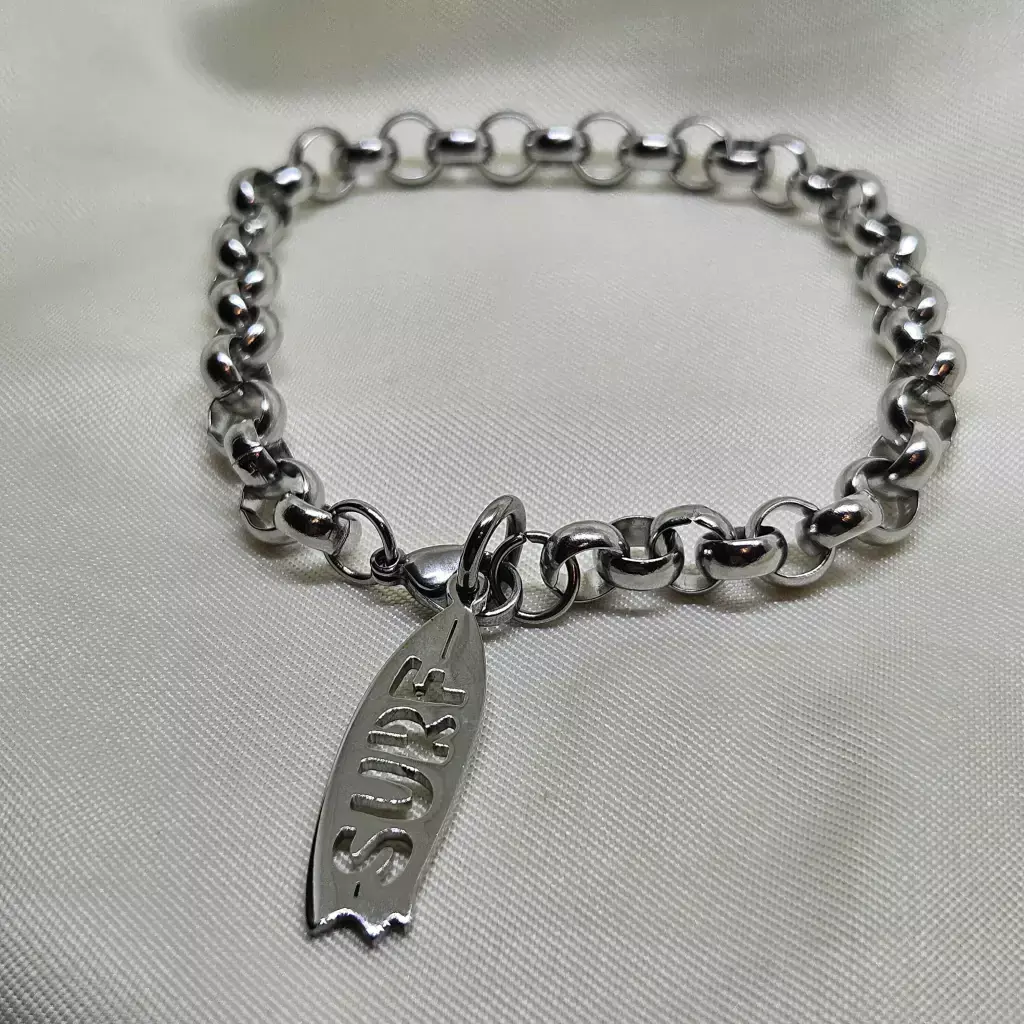 Pulsera Rolo de Acero Quirurgico con dije de Acero Quirurgico de excelente calidad. El acero quirurgico es un material inalterable y antialérgico.